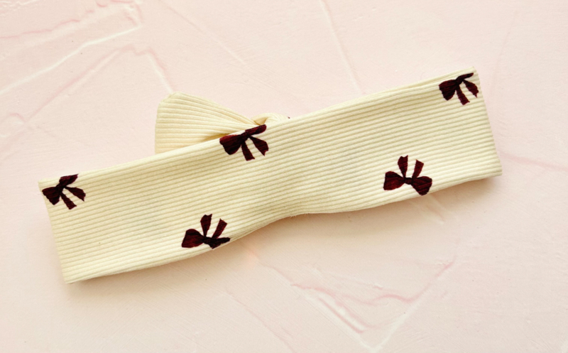 Prachtige knoophaarband in een offwhite fijne ribstof met burgundy strikjes.