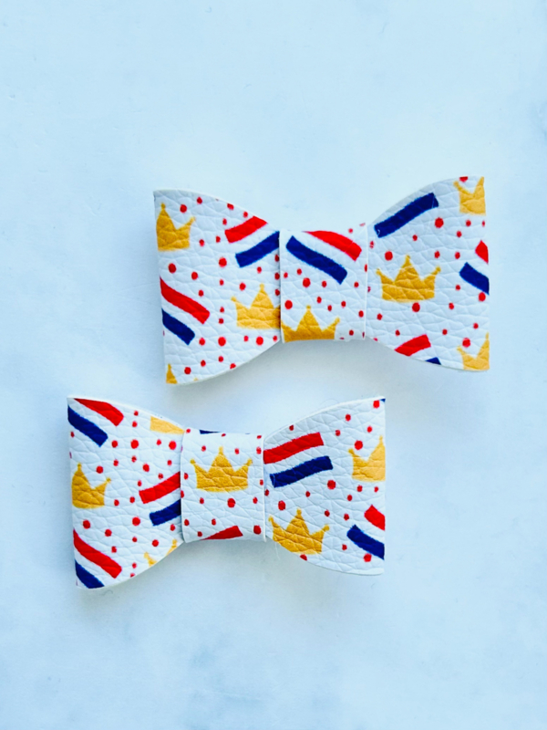 Draag de vlag met trots in je haren! Witte strikjes met vrolijke Hollandse vlaggen, kroontjes én oranje confetti.